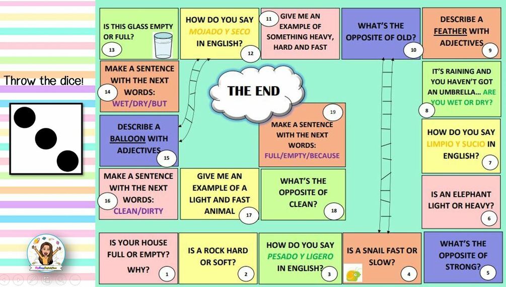 Incluye un enlace que te llevará a un video de youtube para aprender estos adjetivos; un apartado de repaso en el que encontrarás flashcards para refrescar tu memoria y por último, un parchís con un dado interactivo en el que tendrás que ir avanzando y contestando las preguntas de cada casilla relativas a lo aprendido para llevar a la práctica estos contenidos.